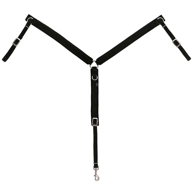 Help keep your sidekick’s saddle tack from sliding back with the Weaver Leather Felt Lined Ring-in-Center Horse Breast Collar. This one-inch webbing breast collar for horses features half-inch thick black felt on the breast pieces and center strap for comfort. The center ring is crafted using non-rust stainless steel and the additional hardware is nickel-plated for durability. This horse breast collar includes a D-ring for tying down as well as a snap for attaching a cinch.