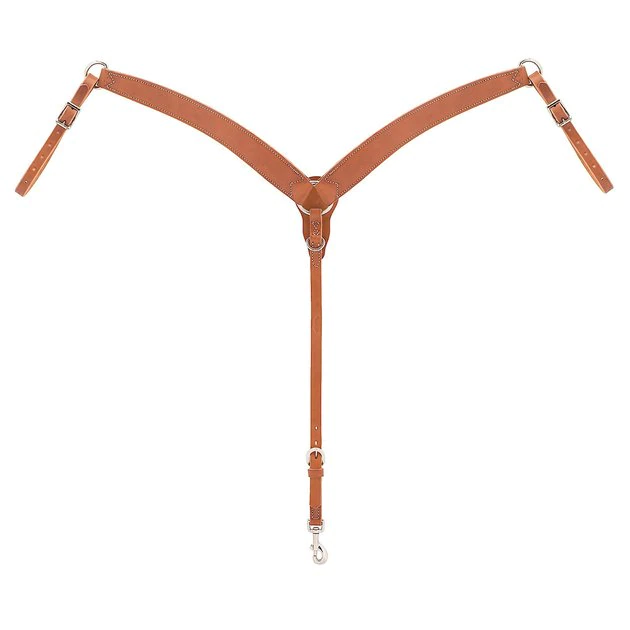 The Weaver Leather Horizons Contoured Ring-in-Center Horse Breast Collar is durable enough to withstand the demands of daily rides. The high-quality golden-brown leather features doubled and stitched breast pieces. An adjustable center strap allows for an ideal fit, and the center ring features a leather backer to help prevent rubs during long days in the saddle. Contoured breast pieces taper from 1.75 to 1.25 inches wide for both fit and comfort. Now your saddle isn’t going anywhere, no matter how rough the ride!