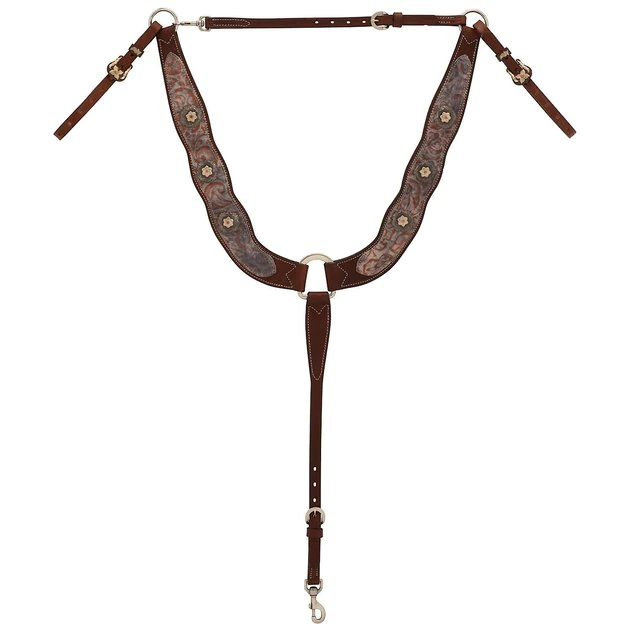 Complement your horse’s true beauty with the Weaver Leather Patina Rose Pulling Horse Breast Collar. This pulling breast collar is made with durable scalloped brown bridle leather. The stunning design is rich with details including embossed leather overlaid with blue and rust hues, exclusive brown iron floral buckles and German silver trim accents. Each collar is finished with matching conchos and hardware for a high-quality look. Plus, the pulling design lets your horse’s shoulders move freely for better leverage during riding.