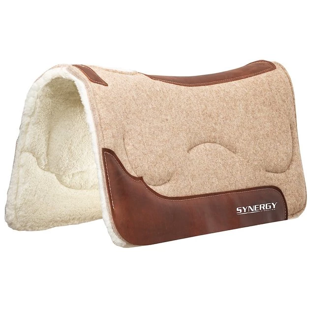 Thanks to its innovative shape, the Weaver Leather Synergy Natural Fit Horse Saddle Pad can support your training and even encourages collection. The natural fit shape creates a pocket for your horse’s back to rise up into as he collects. EVA sport foam inserts resist compression, helping the pad to maintain its shape and effectiveness. Natural wool wicks sweat to help evenly cool your horse. Merino wool is also ideal for those sensitive-skinned horses. A handwoven New Zealand wool topper paired with premium top grain wear leathers make this pad highly durable so you can use it for all of your schooling rides for years to come.