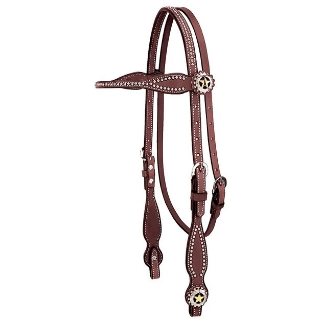 Your horse will be the true star when wearing the Weaver Leather Texas Star Horse Browband Headstall. With style that’s straight out of Texas, this headstall features nickel-plated zinc die cast Texas star conchos sporting 18-karat-gold-plated stars guaranteed to make a big impression. Nickel brass spots also frame the headstall and browband, paired beautifully with durable non-rust stainless-steel buckles. Crafted from doubled and stitched 5/8-inch premium English bridle leather, this headstall combines eye-catching style with a durable performance.